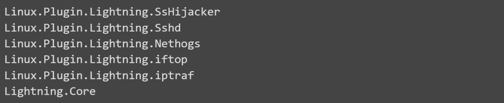 This piece of malware will also install its very own backdoor that is based on SSH by starting an SSH server by making use of one of the plugins that were downloaded. This brings us to the very end of this list (Linux.Plugin.Lightning.Sshd).