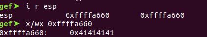 The location of the stack pointed to by the (ESP) register is at 0xffffa660 and we can manipulate the value stored. In this case, we overwrite ESP with AAAAA: